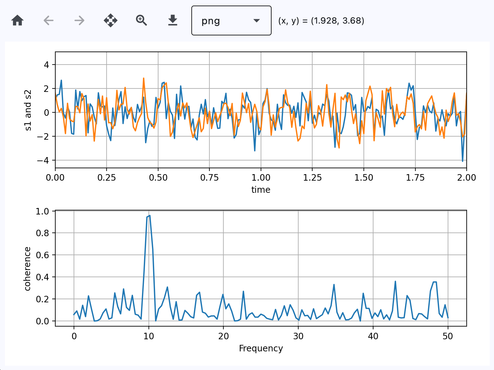 # Two signals with a coherent part at 10Hz and a random part