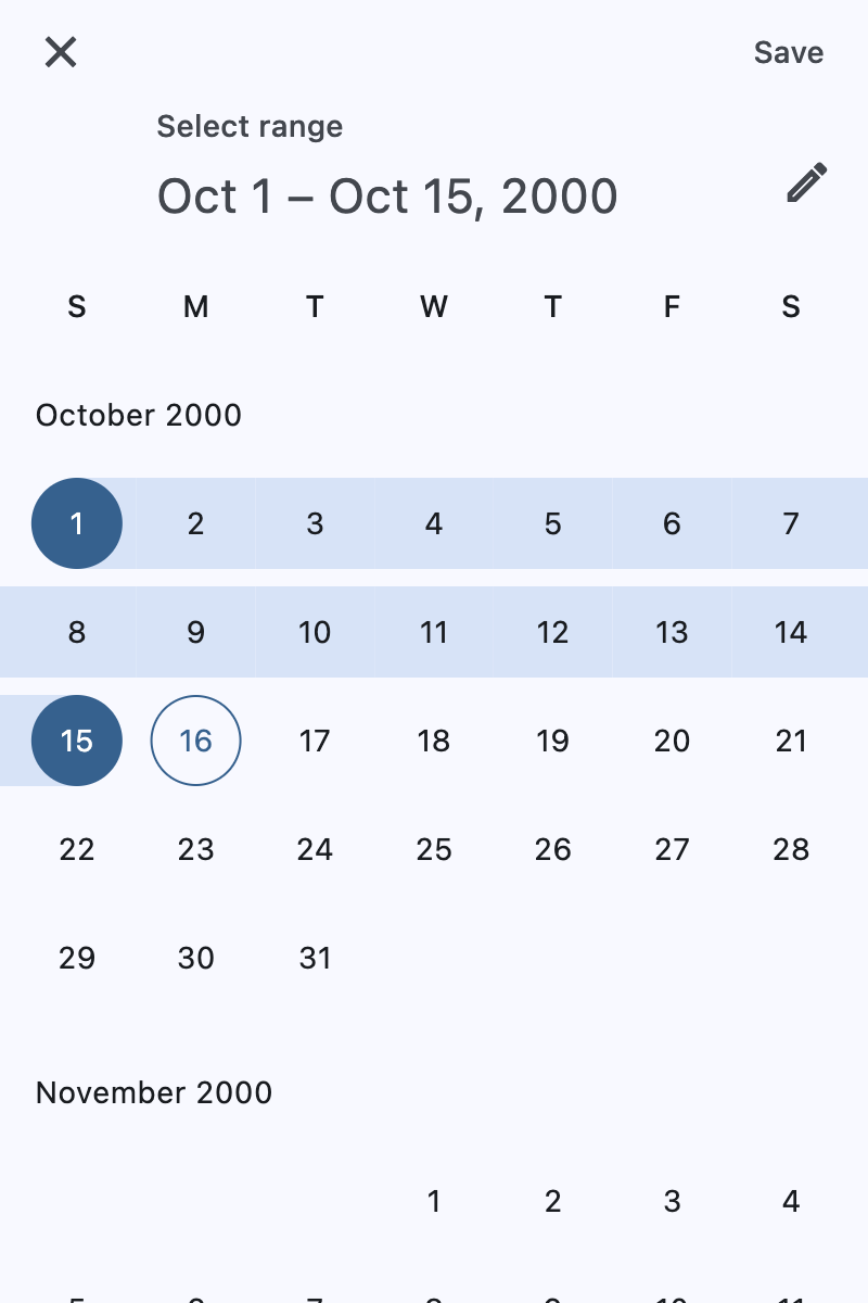 A Material-style date range picker dialog.