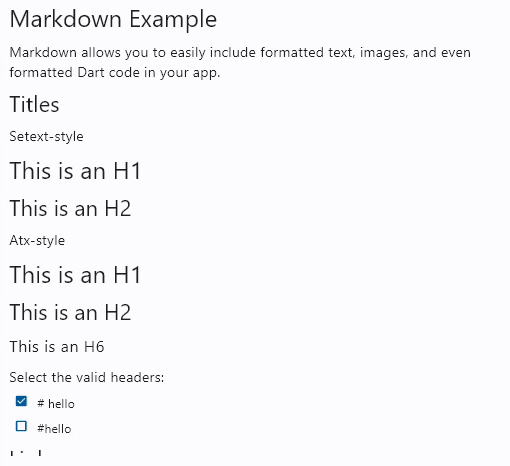 void main() { runApp(MaterialApp( home: Scaffold( body: ft.Markdown(data: markdownData), ), )); }